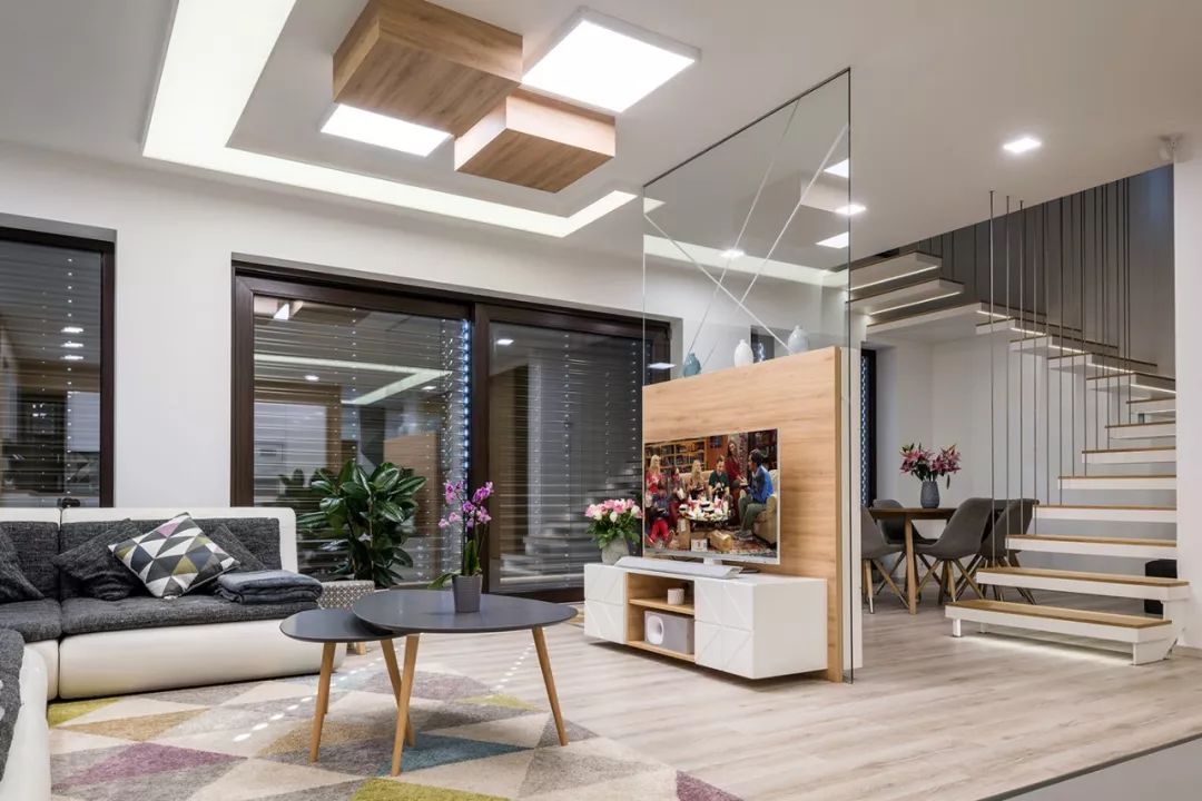 楼梯下方的空间可以用来收纳,也可以设计为内嵌式的书桌/电视墙等功能空间。