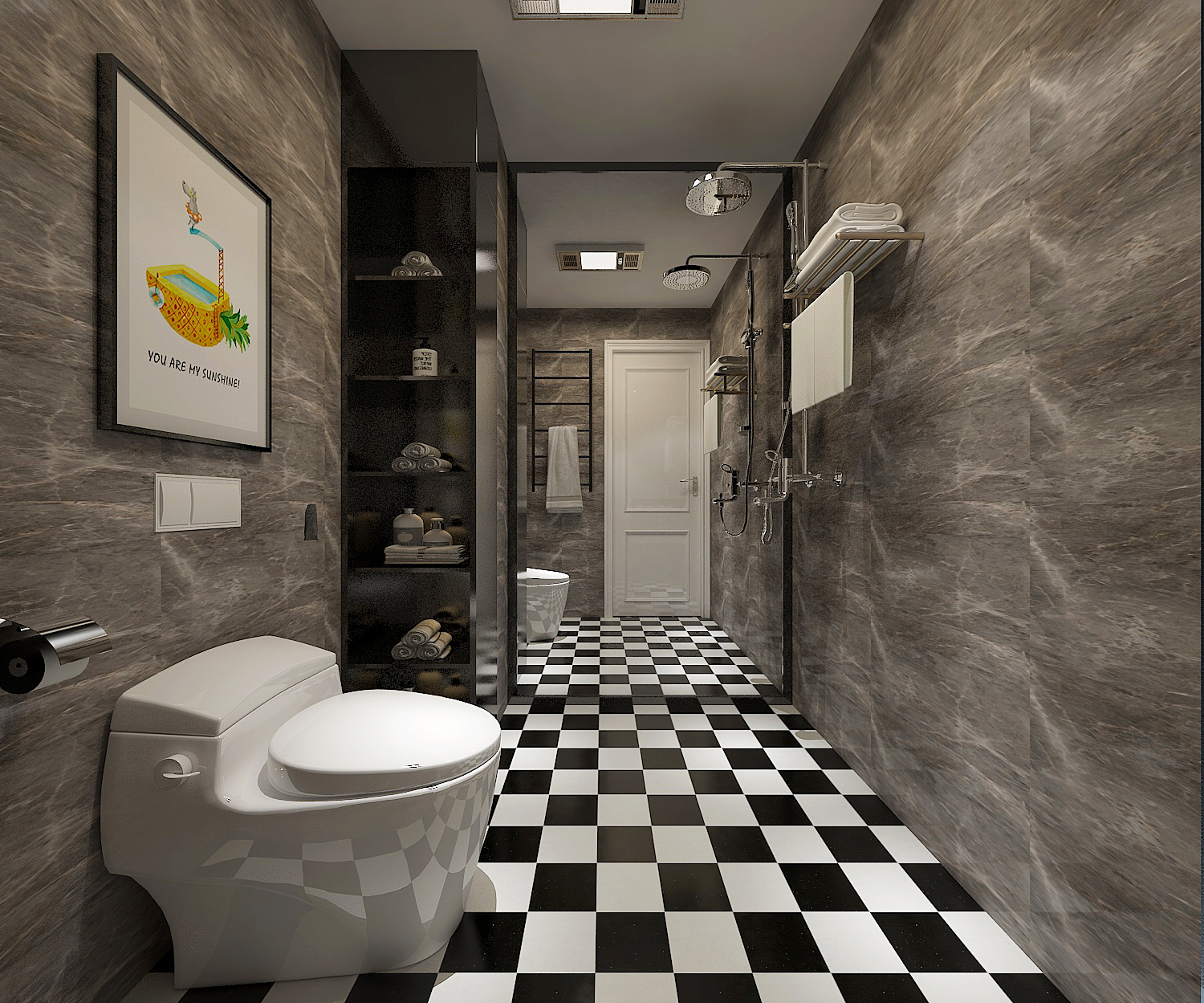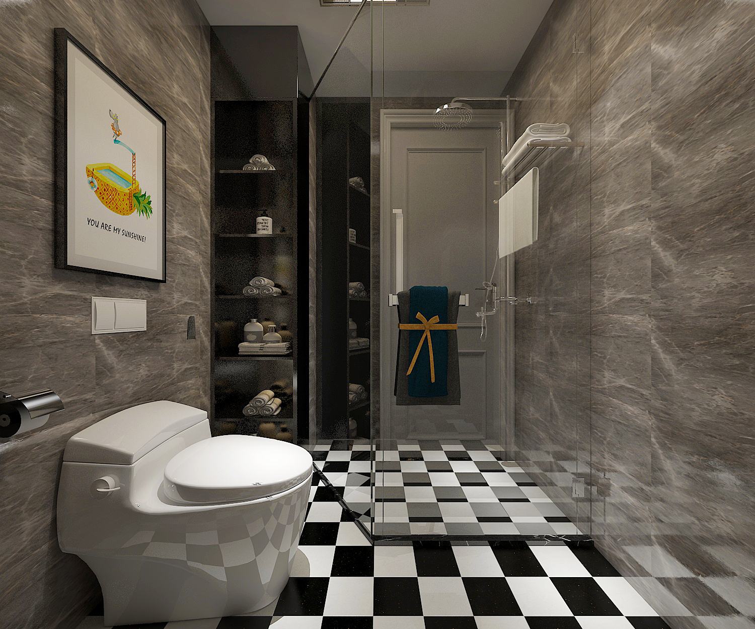 卫生间实现二分离的设计,浴室柜外置,考虑到卫生间水汽比较重,地面选用防滑瓷砖,黑白方格瓷砖美观又大气,钻石型淋浴房让卫生间装修档次提高3倍,置物架做到顶,日常生活用的洗化用品以及毛巾都可以放置在置物架上。