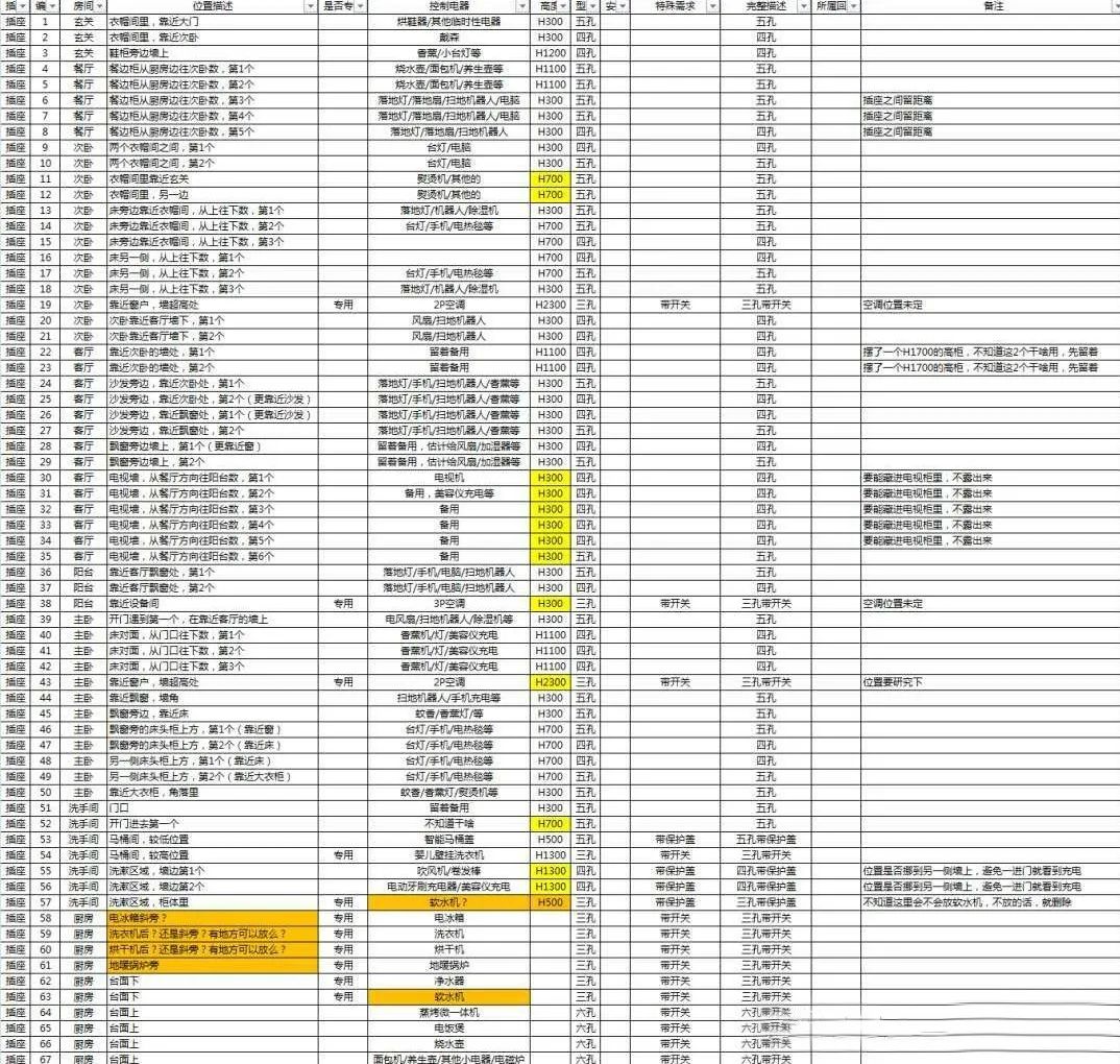 设计的开关、插座特别多,为了保证不出错,屋主特地做了非常详细的明细表,确保每一个插座都在正确的位置(方位/高度),是正确的类型(三孔还是五孔,带不带开关),入住后实际使用也发现规划得非常顺心。