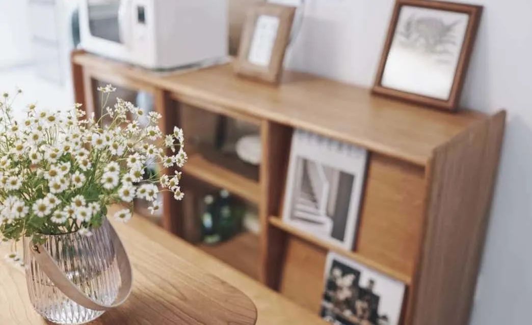 摆放餐边柜后,和餐桌之间的空间就狭窄了,所以屋主选的是非抽屉款,虽然使用中可能需要弯腰拿取物品,但避免了抽屉打开挪转不开的尴尬。