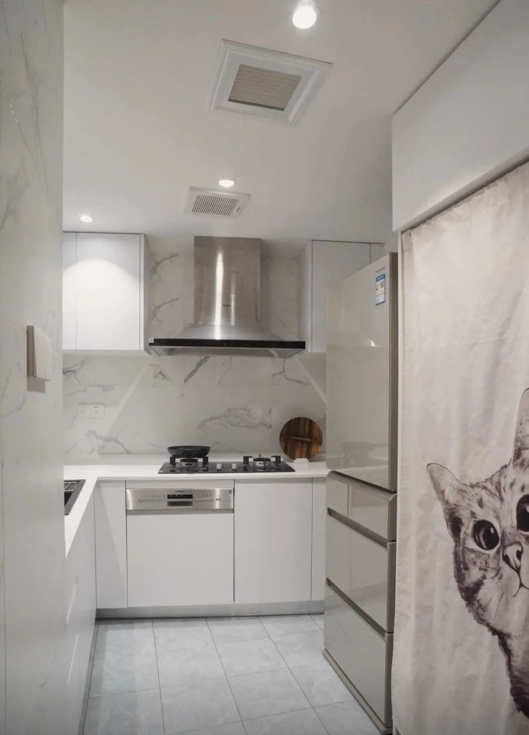 在屋主的改造中,处处可见放大的自我需求,比如对空间合理利用,做出2个衣帽间;拒绝狭长的次卧;厨房变U字,让动线更顺手;照顾感官,拉平斜墙;更重要的是,